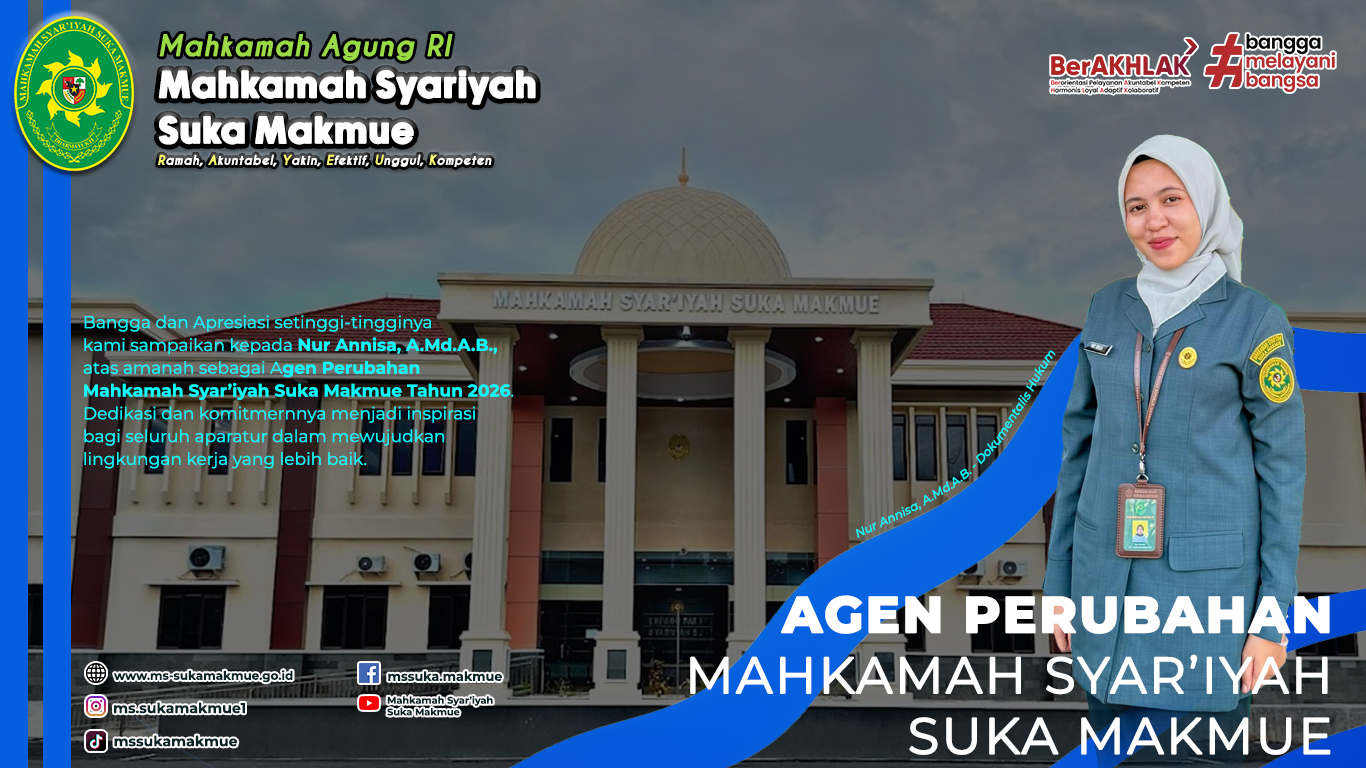 Selamat Datang di Website Resmi Mahkamah Syar'iyah Suka Makmue. Website ini merupakan website pengadilan yang sudah sesuai dengan Pedoman Rancangan dan Prinsip Aksesibilitas Website Pengadilan di Lingkungan Mahkamah Agung. Selain itu website ini dapat diakses oleh masyarakat yang difabel.
